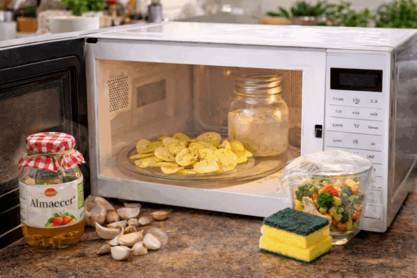 Bögre víz + citromlé vagy ecet, 3–5 perc melegítés, majd 2 perc pihentetés csukott ajtóval.