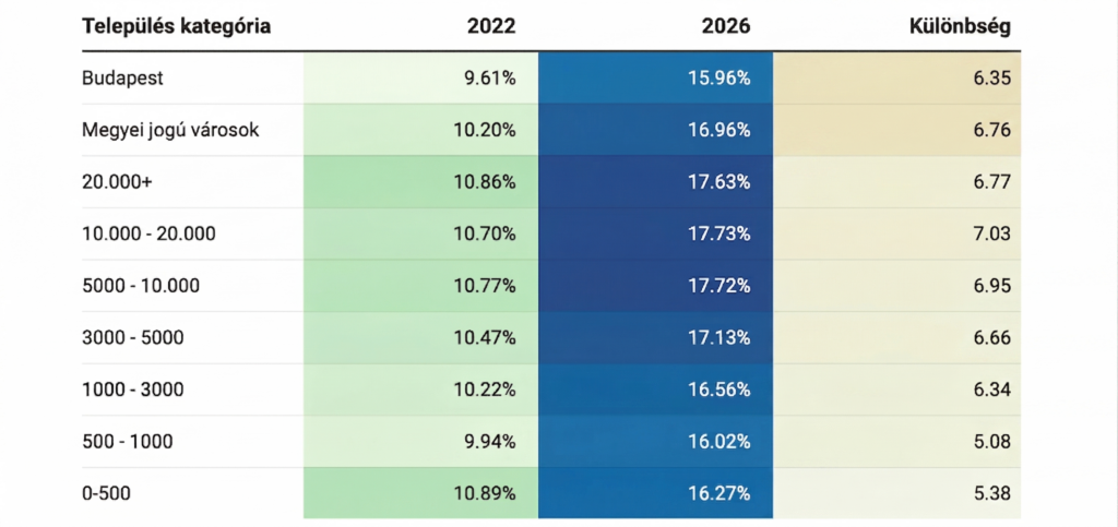 A településtípusok szerinti bontás talán a legizgalmasabb képet mutatja. Az adatok alapján jelenleg a kisvárosok a legaktívabbak, ami szintén eltér a megszokott mintázattól.