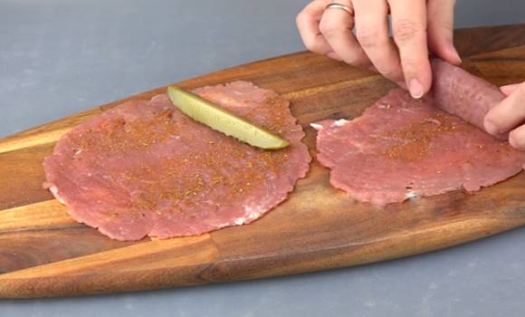 Mindegyik darab húst sózzuk és fűszerezzük, majd tegyünk a szélére egy darab uborkát és tekerjük fel.
