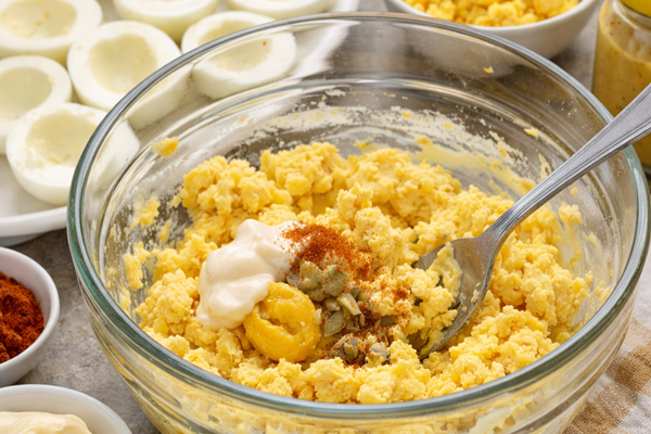 A vaj legyen puha, így sokkal könnyebb krémesre keverni a tölteléket. A mustár mennyiségét ízlés szerint növelheted, ha pikánsabb ízeket szeretnél. A citromlé nemcsak ízesít, hanem frissességet is ad a szósznak.