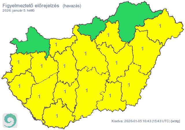 Emellett havazás miatt elsőfokú figyelmeztetés van érvényben számos vármegyében, ahol 12 óra alatt 5 centiméternél több hó hullhat.
